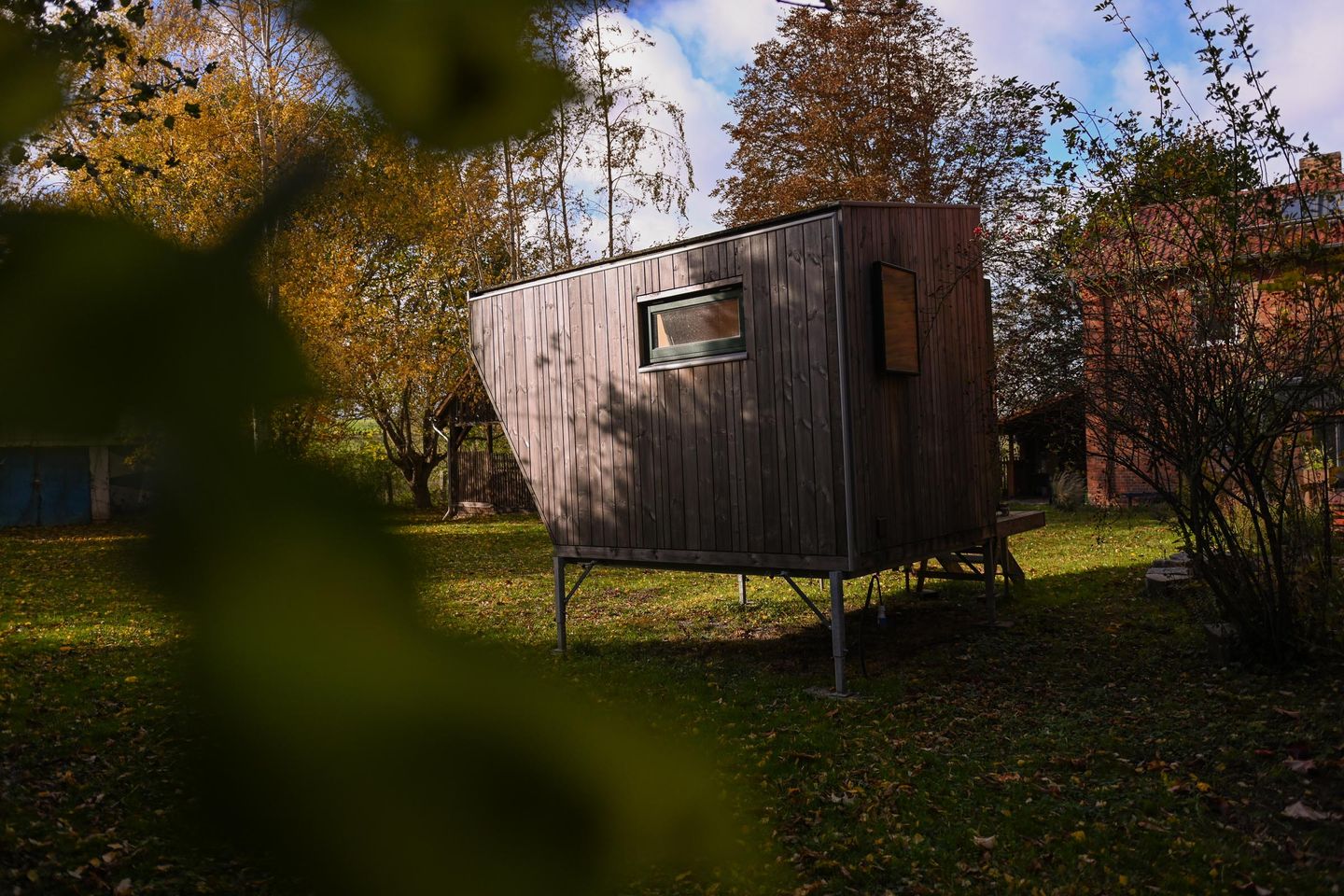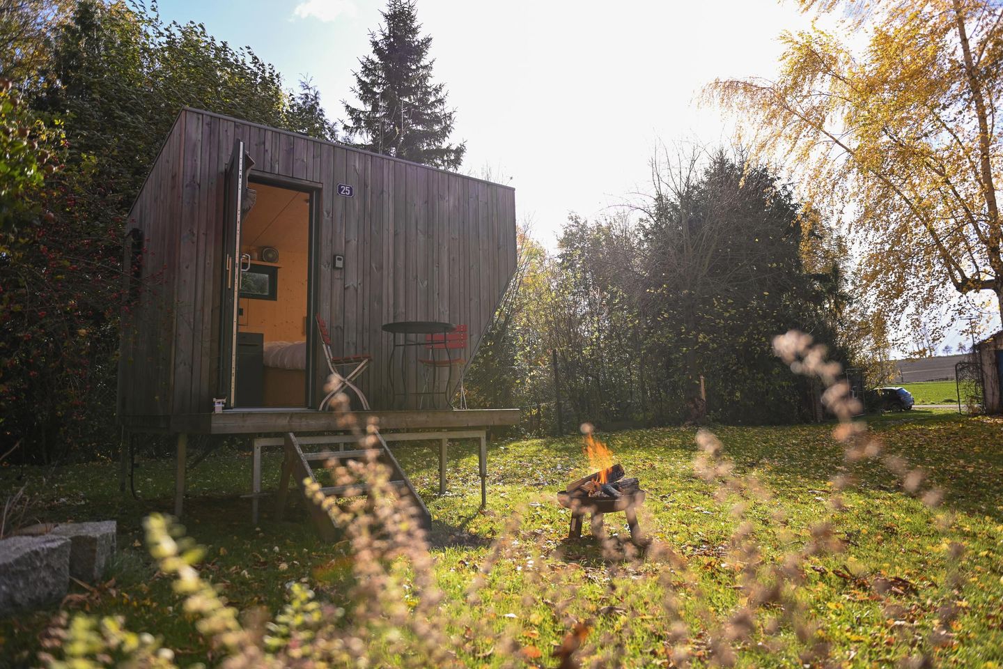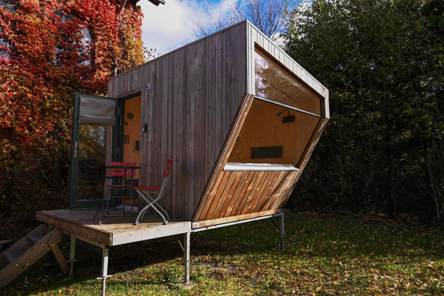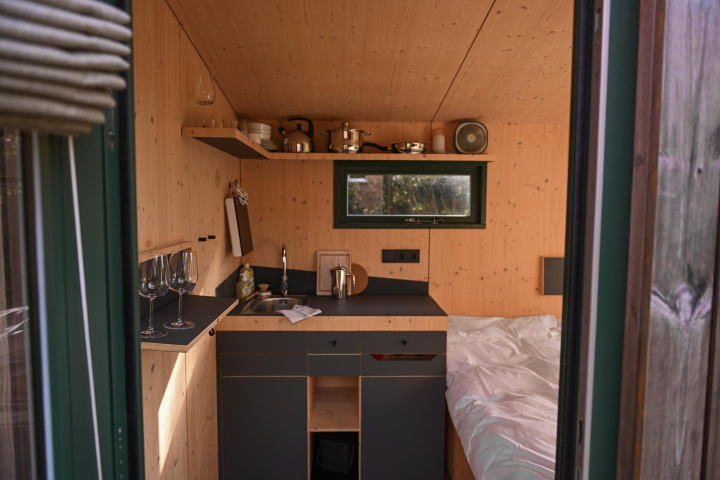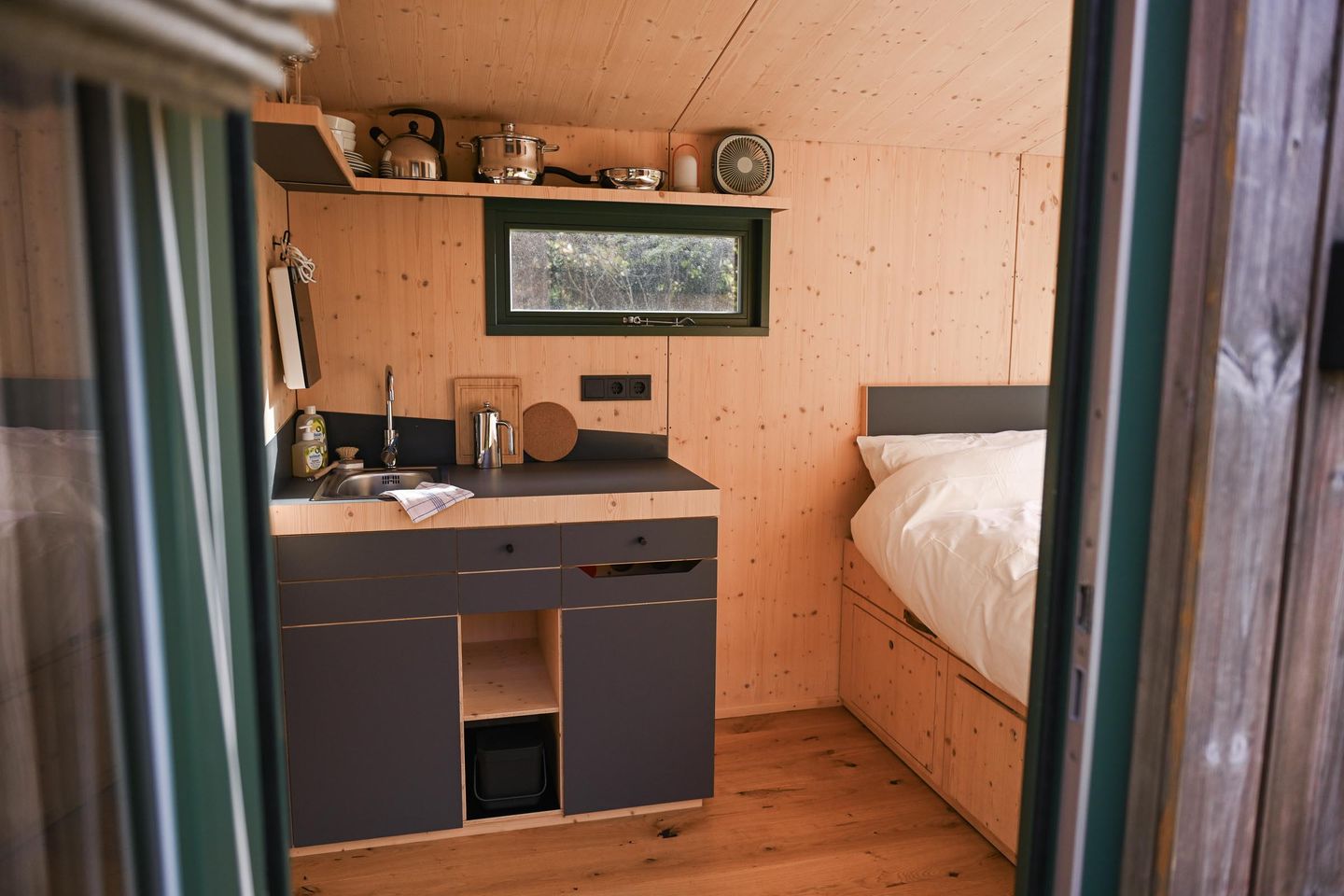Auf nur rund fünf Quadratmetern findest du alles, was du brauchst, um auf kleinem Raum groß zu leben. Das große Panoramafenster bringt Licht und Natur direkt in den Raum und öffnet den Blick auf das bewachsene Grundstück. Tagsüber lädt die Loungefläche zum Entspannen ein – mit einem Buch, einem Kaffee oder einfach beim Beobachten der Natur. Abends verwandelst du diesen Bereich in dein gemütliches Bett (1,40 × 2,00 m) mit hochwertiger Bettwäsche, Decken und Kissen. Die Atmosphäre ist klar, ruhig und reduziert – und genau dadurch besonders wohltuend.