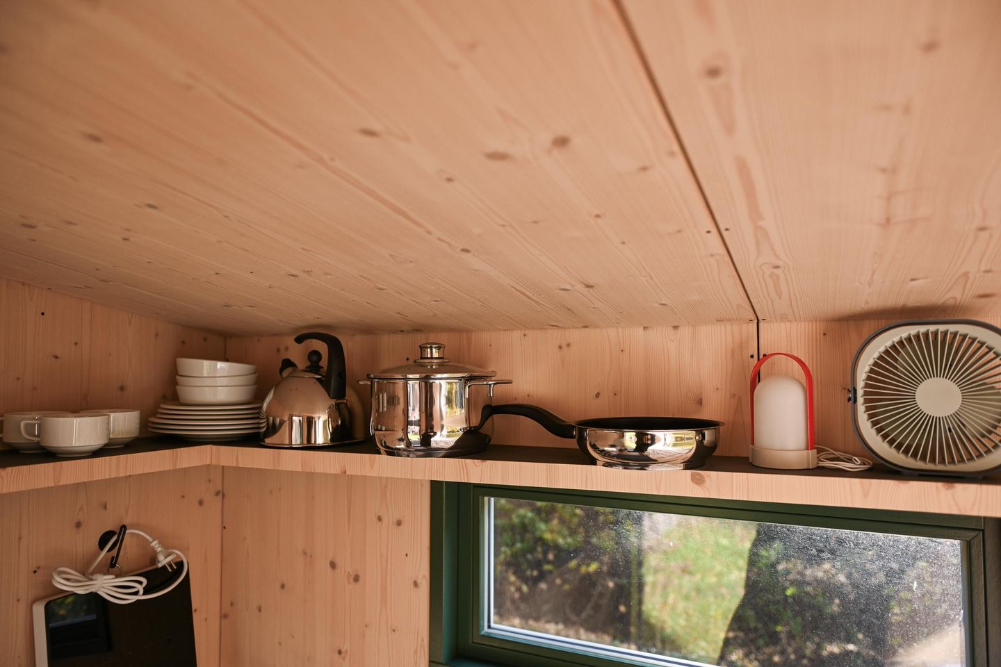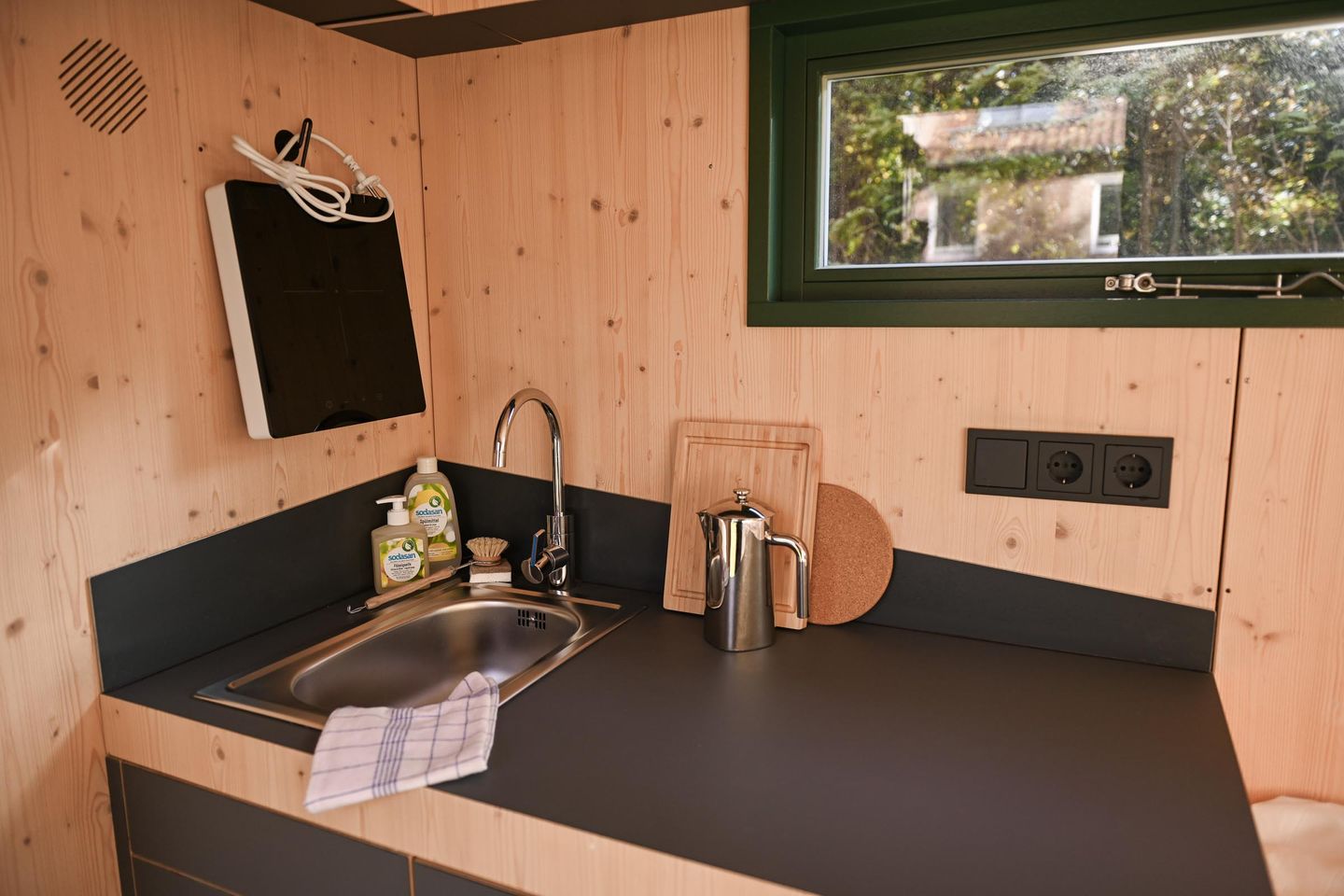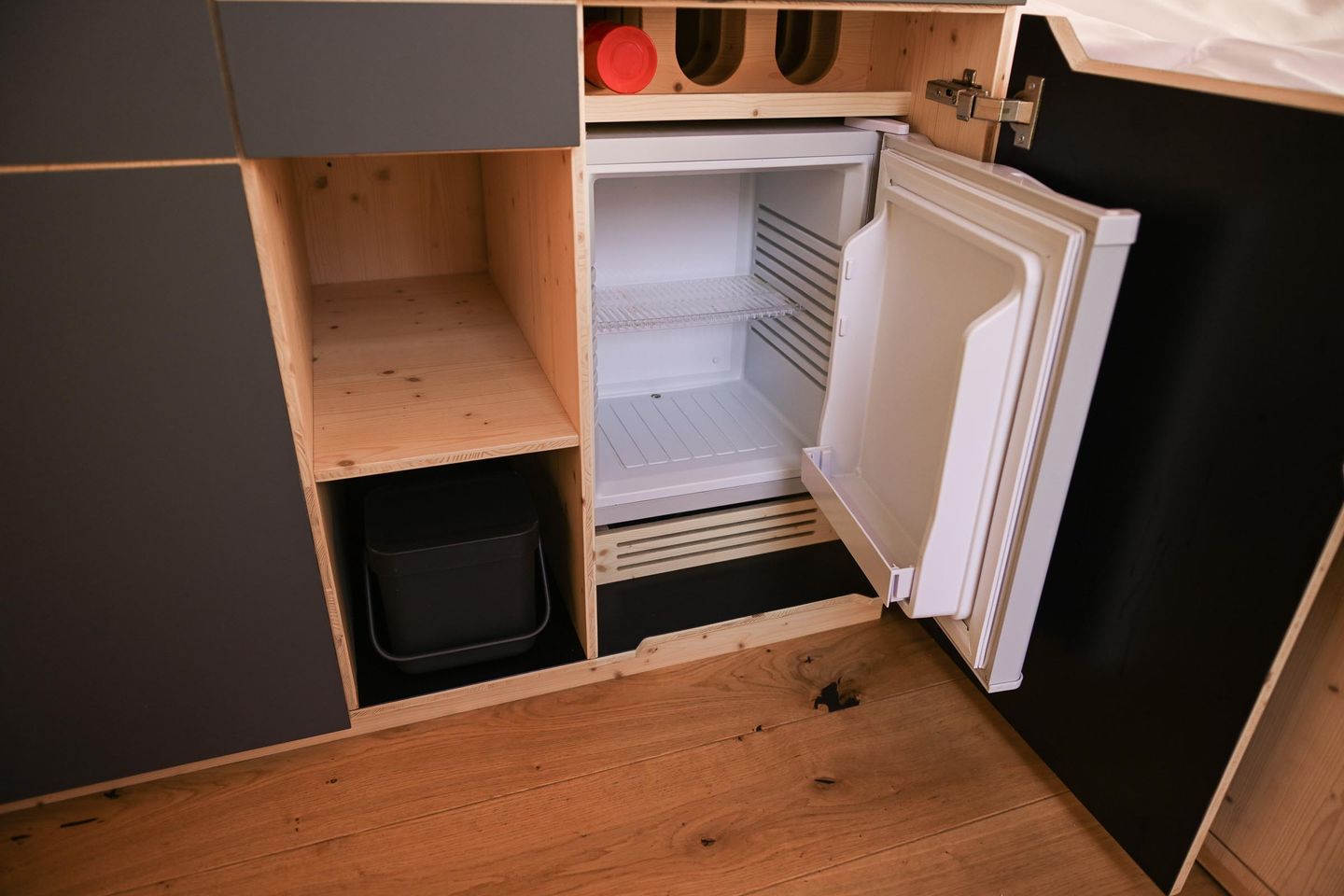 Die kleine Kochnische ist so gestaltet, dass du dich selbst versorgen kannst, ohne Aufwand. Es gibt einen Mini-Kühlschrank, ein mobiles Induktionskochfeld, eine French Press und einen Flötenkessel für deinen Kaffee oder Tee am Morgen, dazu Geschirr, Pfanne, Topf, Besteck und Reinigungsmittel. Das Wasser im Sleep Space stammt aus der hauseigenen Brunnenanlage – perfekt zum Spülen und Waschen –, während dir frisches Trinkwasser zum Kochen und Trinken über bereitgestellte Kanister zur Verfügung steht. So bleibt alles im Sinne der Nachhaltigkeit: einfach, funktional, umweltbewusst.
