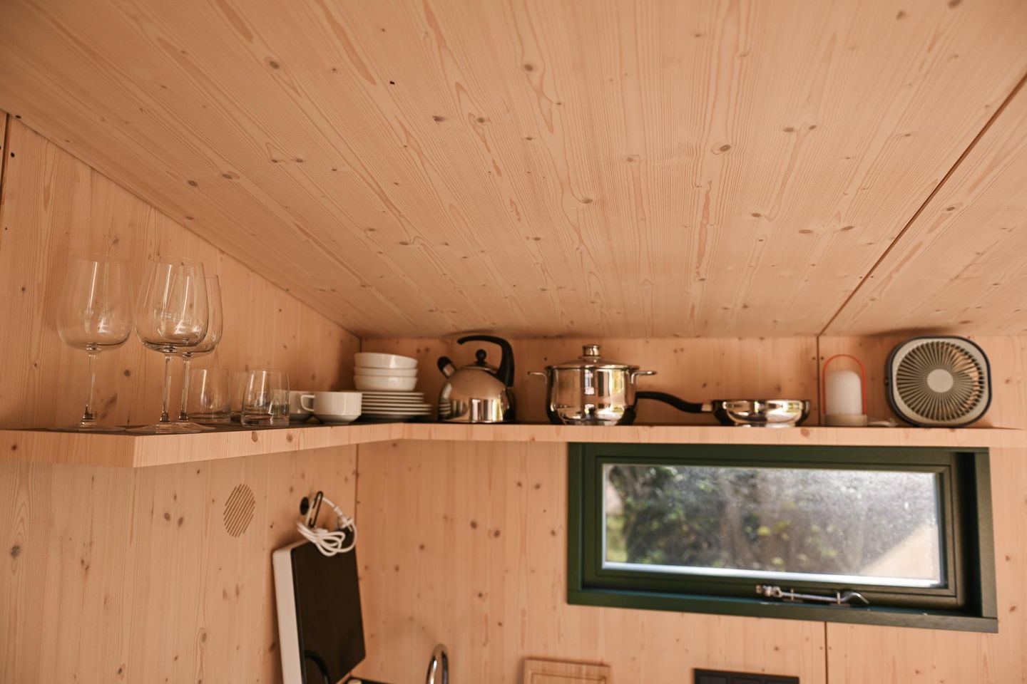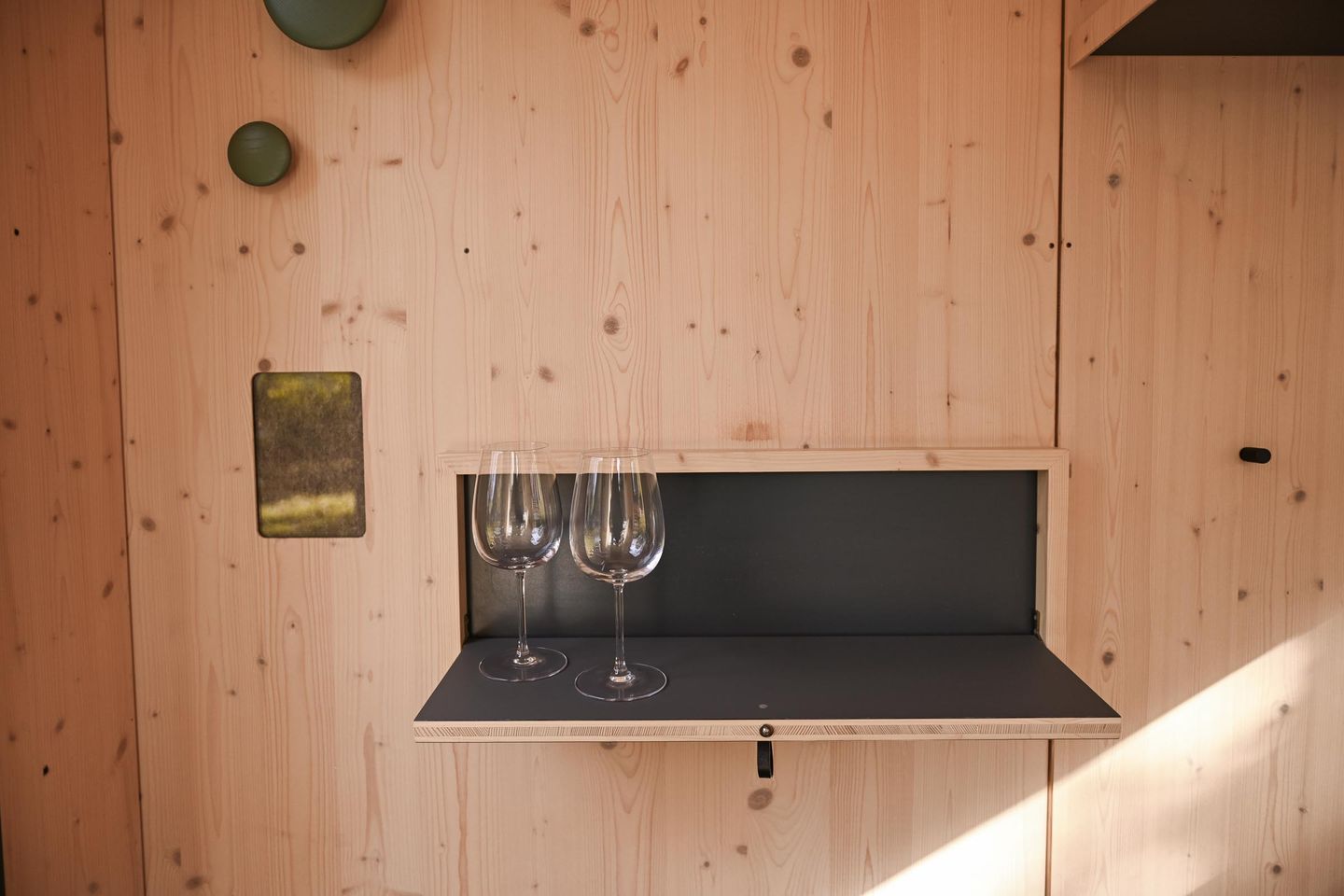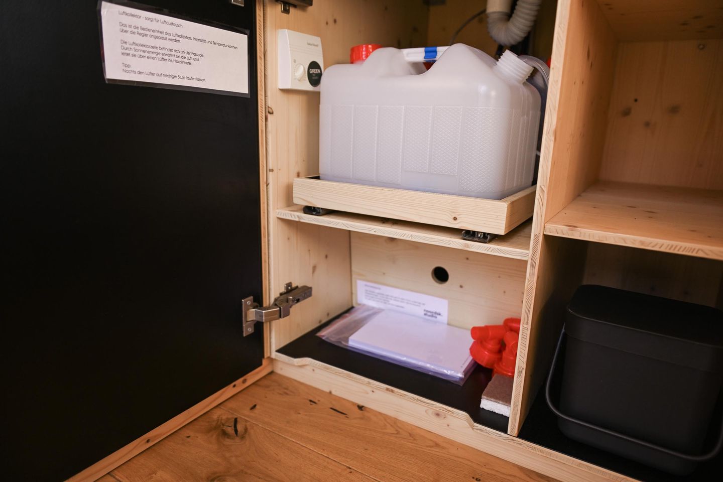 Die kleine Kochnische ist so gestaltet, dass du dich selbst versorgen kannst, ohne Aufwand. Es gibt einen Mini-Kühlschrank, ein mobiles Induktionskochfeld, eine French Press und einen Flötenkessel für deinen Kaffee oder Tee am Morgen, dazu Geschirr, Pfanne, Topf, Besteck und Reinigungsmittel. Das Wasser im Sleep Space stammt aus der hauseigenen Brunnenanlage – perfekt zum Spülen und Waschen –, während dir frisches Trinkwasser zum Kochen und Trinken über bereitgestellte Kanister zur Verfügung steht. So bleibt alles im Sinne der Nachhaltigkeit: einfach, funktional, umweltbewusst.