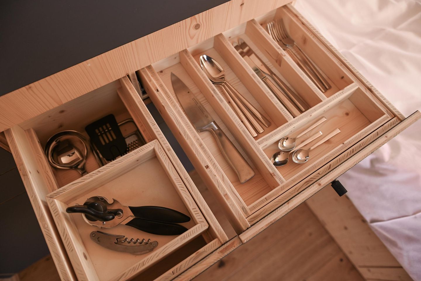 Die kleine Kochnische im Sleep Space ist kompakt und durchdacht: Mini-Kühlschrank, mobiles Induktionskochfeld, Flötenkessel, French Press, Geschirr und Kochutensilien stehen bereit, um dir einfache Mahlzeiten zuzubereiten. Das Brunnenwasser eignet sich zum Spülen und Waschen, frisches Trinkwasser wird in Kanistern bereitgestellt. Wer mehr Platz möchte, nutzt die Küchenzeile im Landhaus – ebenfalls mit allem ausgestattet, was du brauchst.