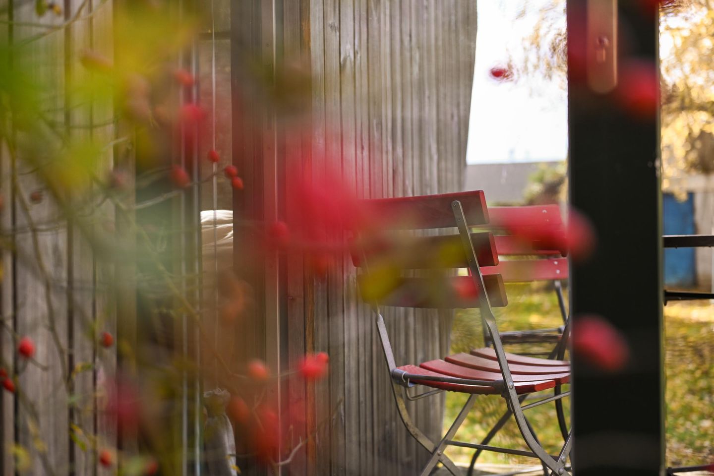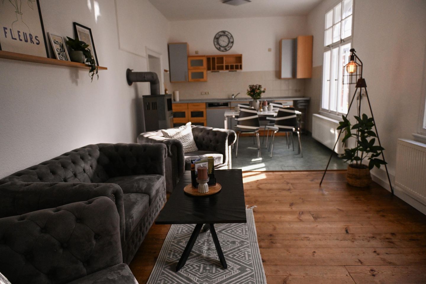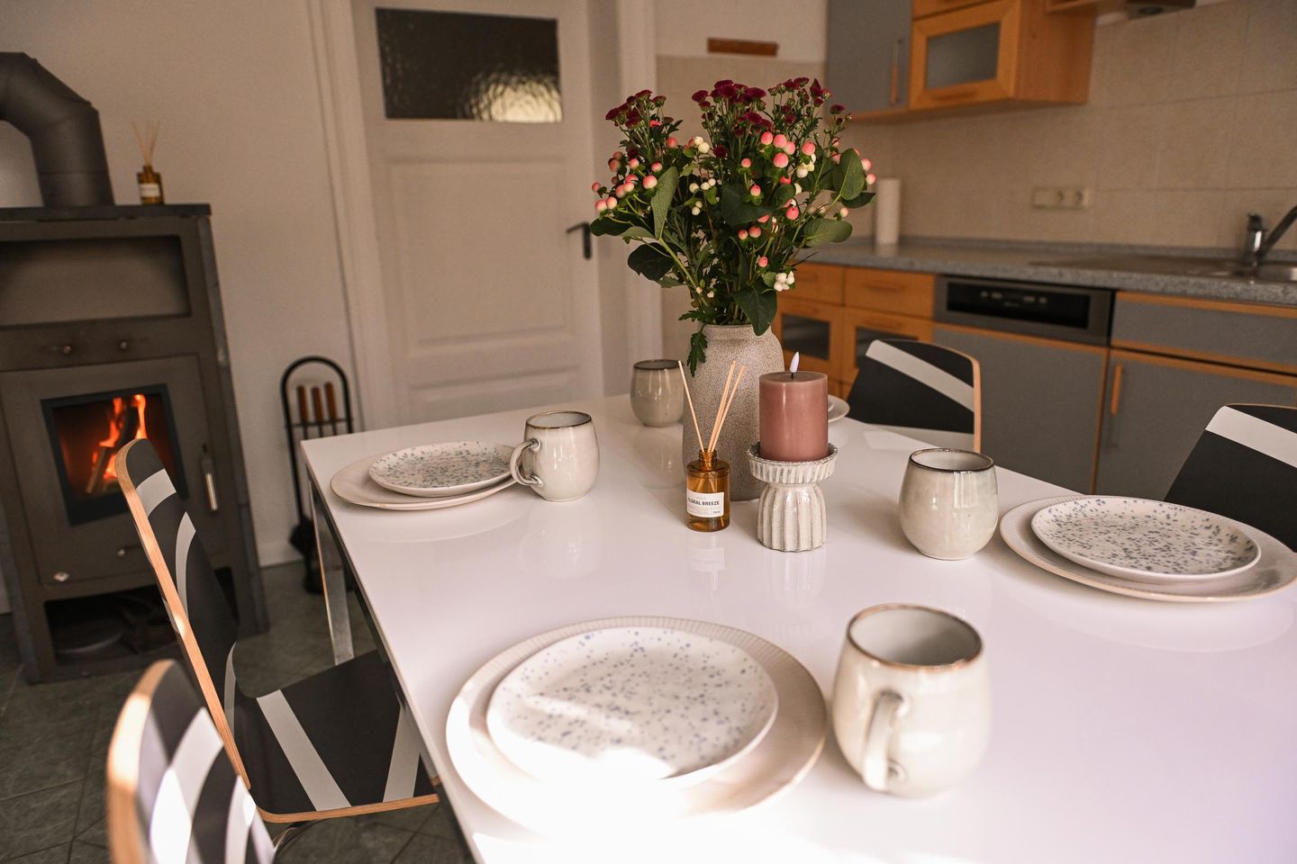 Draußen wartet eine kleine Terrasse mit Tisch und zwei Stühlen auf dich – dein Platz für den Kaffee in der Morgensonne oder für einen stillen Abend im Freien. Auf Wunsch kannst du dir eine Feuerschale dazu buchen und den Tag am knisternden Lagerfeuer ausklingen lassen, während über dir die Sterne stehen. Der Blick schweift über die Felder, über alte Bäume, das Mühlenhaus und das satte Grün des Harzvorlands – ein Ort, der sofort Ruhe schenkt. Parken kannst du direkt auf dem Grundstück. Check-in ist ab 15 Uhr möglich, Check-out bis 11 Uhr – beides erfolgt selbstständig über eine Schlüsselbox an der Unterkunft.