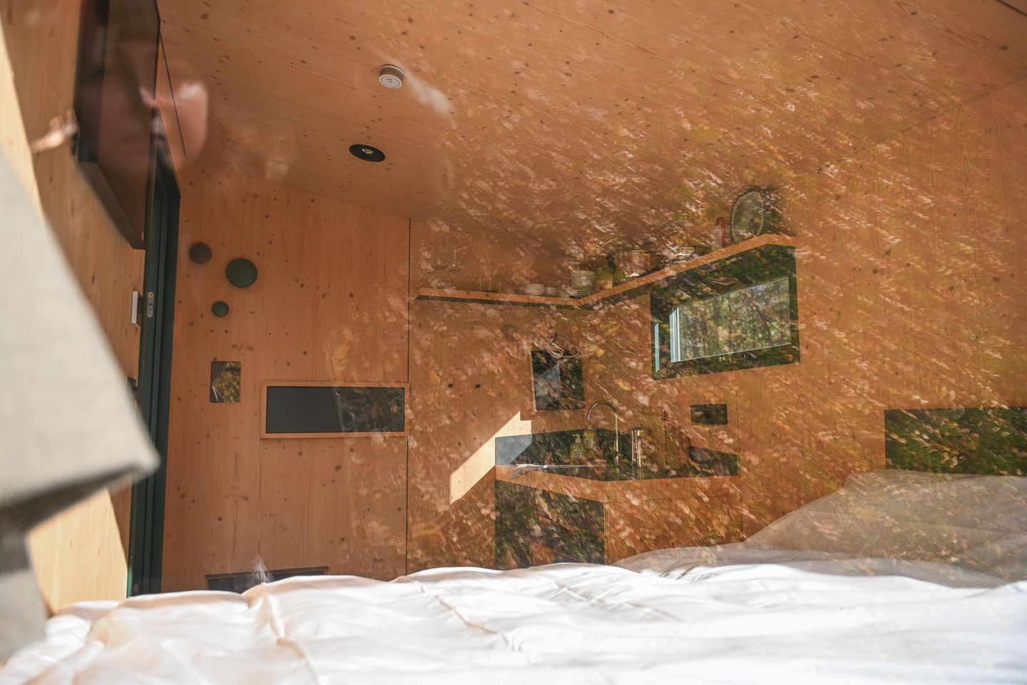 Im Sleep Space erwartet dich eine wandelbare Lounge, die sich abends in ein gemütliches Bett (1,40 × 2,00 m) verwandelt. Das große Panoramafenster bringt Licht und Natur ins Innere und kann für die Nacht abgedunkelt werden. Du schläfst umgeben von natürlichen Materialien, atmest gute Luft und genießt wohltuende Stille – ein Platz zum Abschalten und Erholen.