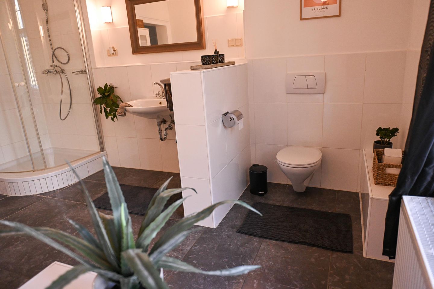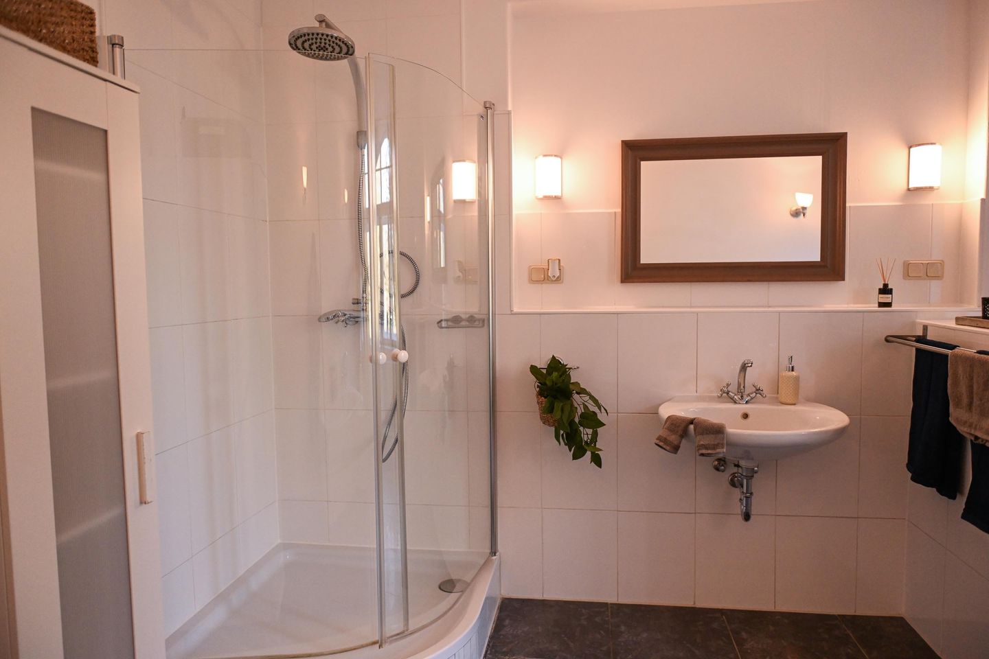 Das Badezimmer im Landhaus erreichst du direkt vom Flur aus links. Es ist hell, modern und bietet Dusche und Badewanne – ideal für entspannte Abende nach einem Tag in der Natur. Wenn das zweite Sleep Space belegt ist, teilst du diesen Bereich mit den anderen Gästen. Handtücher sind inklusive, das Wasser stammt aus der hauseigenen Brunnenanlage.